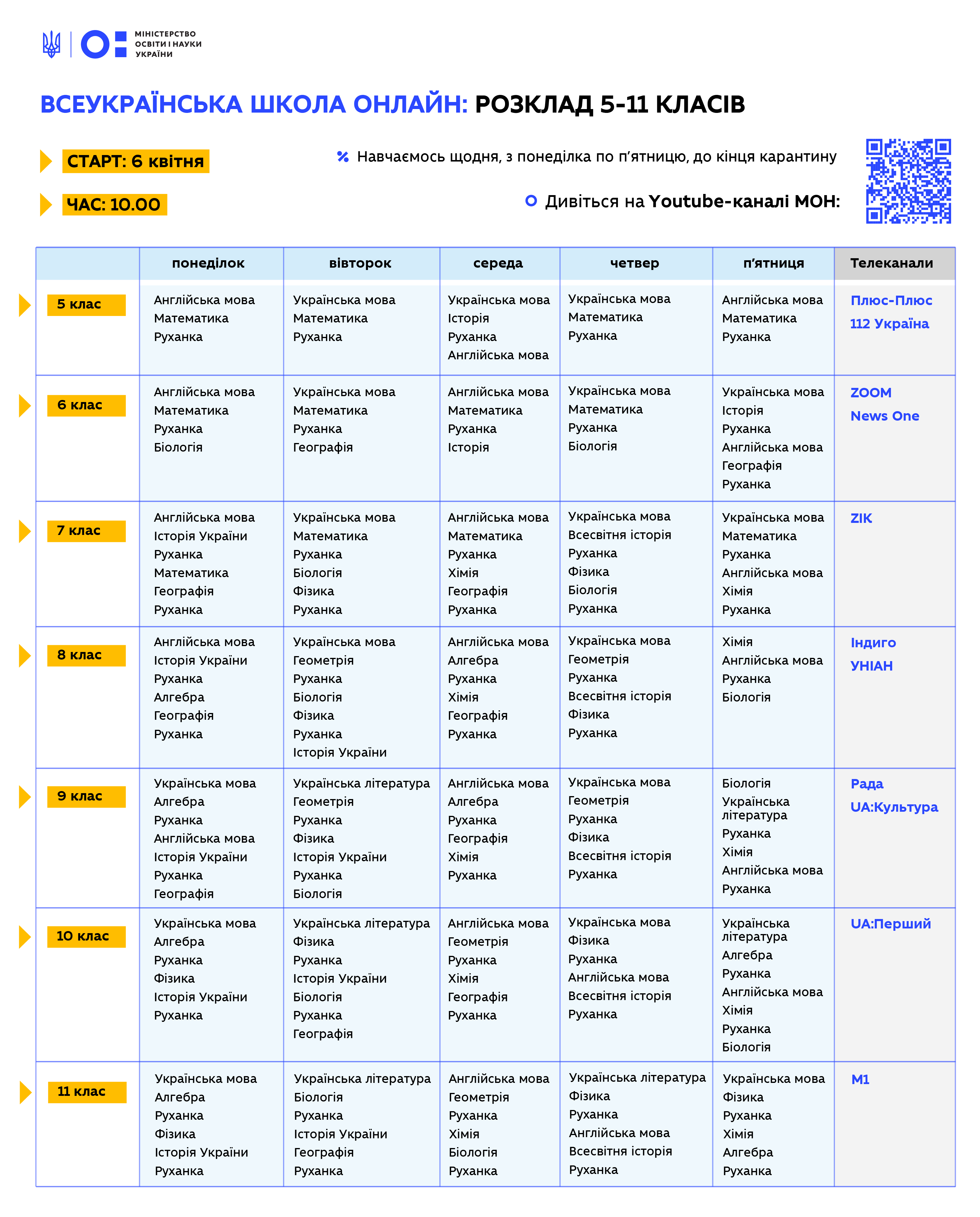 Уроки проходитимуть щодня, з понеділка по п’ятницю, до кінця карантину. Кожного дня вони починатимуться о 10:00.